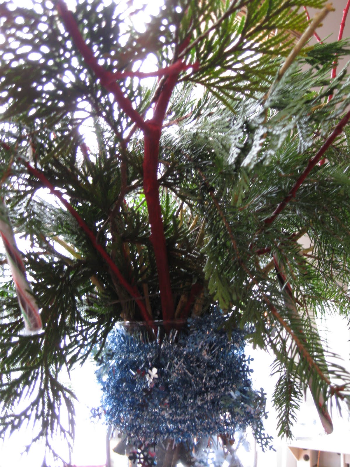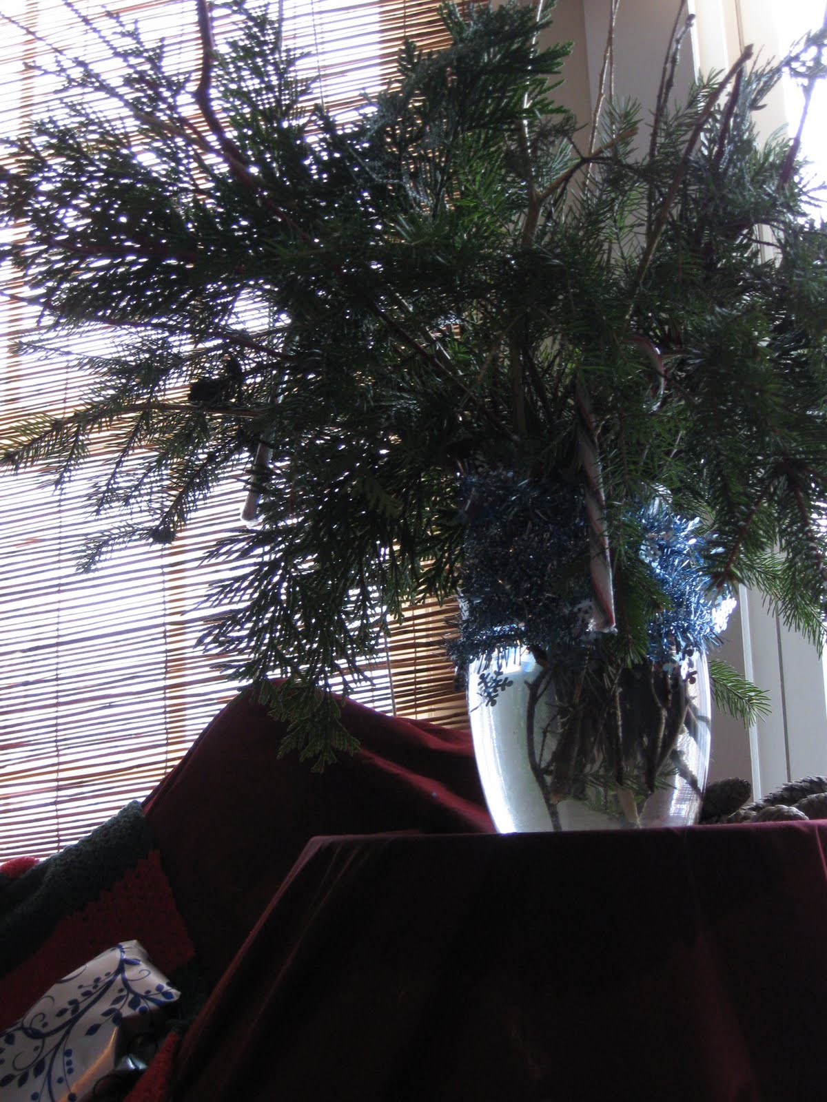 I found some twigs on my walk also and brought them home with me. After I pruned the evergreen to the way I wanted them I arranged the branches in a
