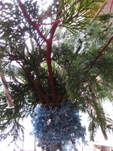 We didn’t have a Christmas Tree this year. I wasn’t really interested in going through all the trouble of moving the furniture, finding one, cleaning up after wards, etc. I DID really want something green and pine-y to put our pile of gifts under. This is my compromise/solution ————->