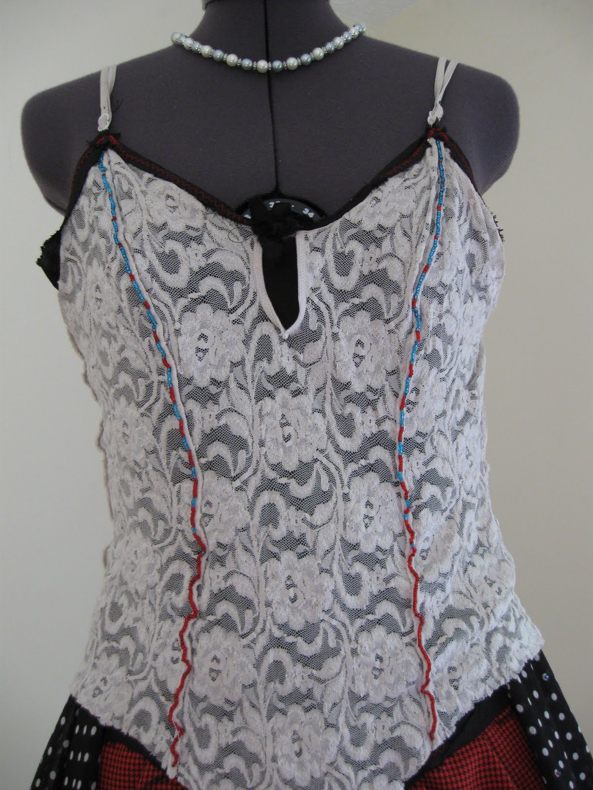 This is the back, where I used a ribbon that matches some of the thread I used AND the beading in the front, to lace up, cinch, and tie in the back.
