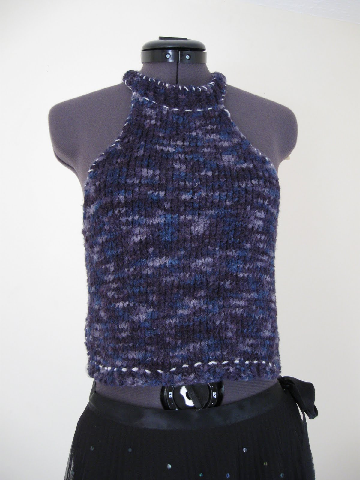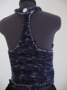 The next summer sweater I made was a halter top style. I used an INCREDIBLY soft blue/purple/lilac yarn and I’m really happy with how it looks knit. The variations in the colors work well. I like how the shirt looks, but I’m not entirely satisfied with it. I made it as an experiment, and it has that sort of look to it, I think. “Trying something new”