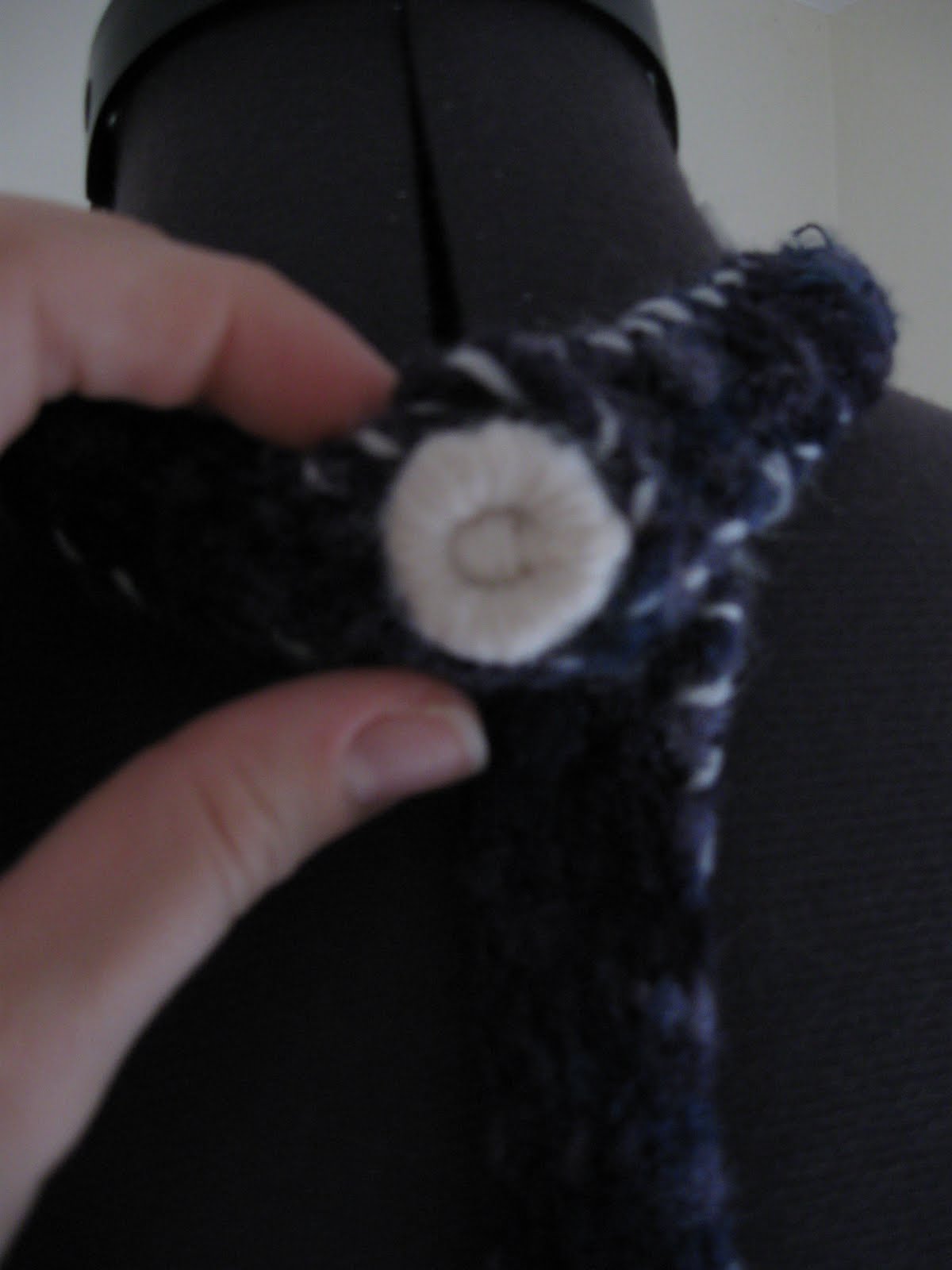 My favorite part about this top is that I MADE a button out of yarn, for the back of the shirt. You can see a little of it in the picture to the left, but I’ll put a close-up down below also, because I think it’s worth it. I don’t remember at ALL how I did it, other than that it was very organic feeling, and I could probably replicate it again by sitting for a while and playing with some yarn and a sewing needle.