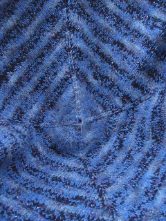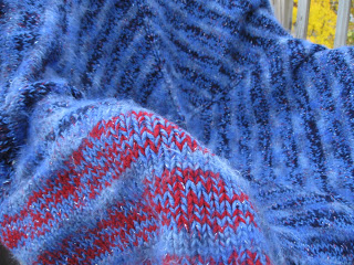 The blanket is knit with a blend of different fibers. A silver strand gives a slight sparkle to the whole piece. A number of different blues are used, and red is also worked in throughout. Three stripes near the outer edge feature a predominantly red blend. I picked out all the yarns involved, and spent a fair amount of time just balling different yarns together before I even set to work! Every step taken for this blanket, I think, was TOTALLY worth it.