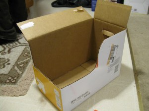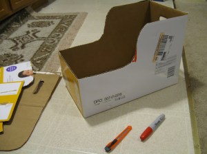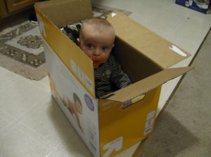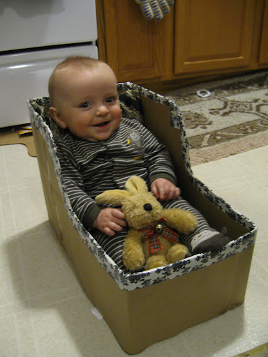 This was the inspiration for this chair… he has a Bumbo, but his legs are starting to be a little big for it. One night after we used the last of the diapers we made a discovery: our little boy fits perfectly inside the box, with a small pillow (or folded blanket) behind him!