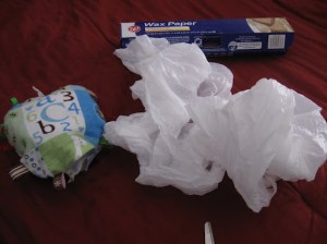 Stuffing (I recycled some plastic bags, crinkly wrappers, and some wax paper)