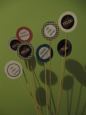 similar to THIS one, so I wouldn’t have to do so much silly circle cutting. Using the drawing program on my computer I made up a sheet of 1″ circles with messages like “I’m ONE-derful” and “YAY! FELIX!”, printed them out, and quickly and carefully hot glued each one to the bottom of Hershey kisses and Rolos.