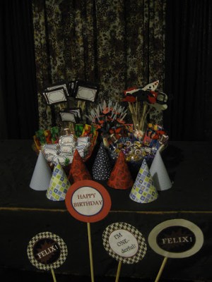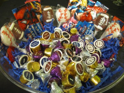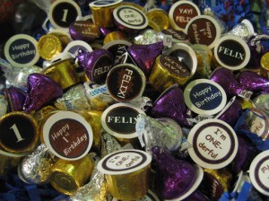 similar to THIS one, so I wouldn’t have to do so much silly circle cutting. Using the drawing program on my computer I made up a sheet of 1″ circles with messages like “I’m ONE-derful” and “YAY! FELIX!”, printed them out, and quickly and carefully hot glued each one to the bottom of Hershey kisses and Rolos.