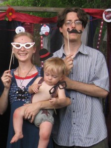 Not wanting to take any chances, I tried hard to set a scene where people just HAD to take pictures. One thing I did was make a “photo booth” backdrop using ribbons and strips of fabric. I hung banners that I had made with ribbon, cardstock, and my glue gun. I made mustache, eyeglasses, and other general Funny Face Photo Props using foam sheets and long wooden sticks from the craft store. This party would never have happened had it not been for my glue gun, I tell you. What a wonderful tool! Mine has a high and low heat setting, so I can work with a wide variety of materials.